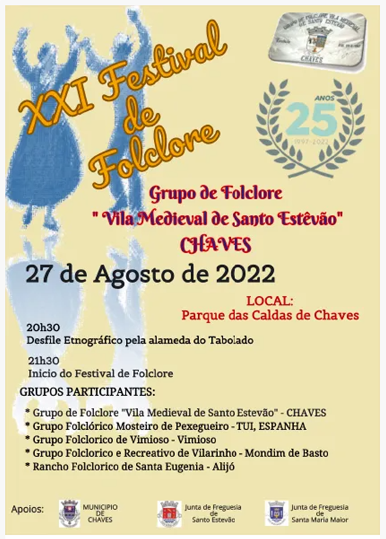 O Festival de Folclore do Grupo “Vila Medieval de Santo Estevão” está de volta à cidade, no próximo sábado, dia 27 de agosto, um evento que preza a tradição e o saber da “nossa terra”, a realizar no Parque das Caldas de Chaves.